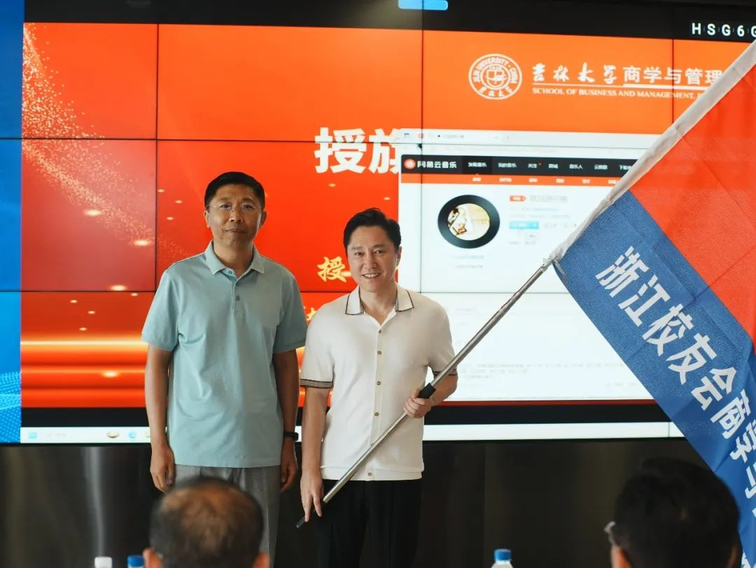 大会在激昂的《吉林大学校歌》声中拉开序幕,熟悉的旋律瞬间唤起校友们心底最温暖的记忆。校友和基金工作办公室主任、校友总会秘书长康永刚郑重宣读《关于同意成立吉林大学校友会浙江省商学与管理学院分会的批复》。商学与管理学院党委副书记兼副院长马腾宣读了首届浙江省吉林大学校友会商学与管理学院分会理事会成员名单。商学与管理学院党委书记赵军将象征分会精神与使命的会旗,庄重授予首任会长郑永吉。分会会旗在钱塘江畔舒展,寓意“求实创新、励志图强”的吉大精神在浙江这片创新热土上薪火相传。